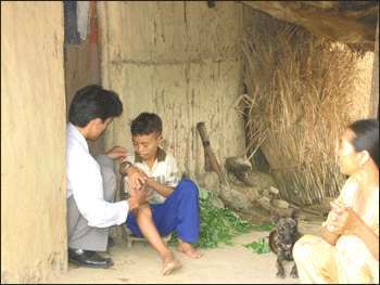 | BTV Công Huy đang xem vết thương của em Nguyễn Khánh Long, xã Hòa Thịnh. Ảnh: T. G |